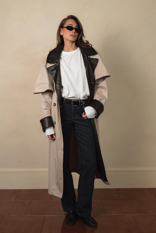 Vegan Leather Trim Trench Coat