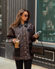 This oversized cocoon jacket is made of supple vegan leather with zippered and contrast patch pockets. It’s designed for a relaxed fit, with a quilted inner lining and snap buttons reinforced by a hidden zip closure.