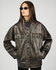 Inspired by the nineties, this oversized leather jacket has a patina-like finish. It features snap-button closures that lead to a mockneck collar, and front pockets.