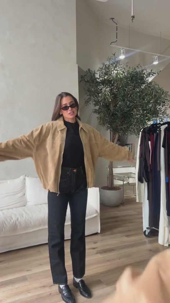 This collared zip-up suede bomber is cut for an oversized fit. It has a bubble hem featuring encased elastic, and wide, cuffed sleeves with ruching.