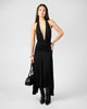 This draped knit halter dress has a ruched waist, an open back and a sweeping midi skirt with a high-low hem.