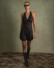 Cut on the bias for a flattering drape, this satin minidress features delicate lace trim along the neckline and hem. Ruching detail shapes the halter-style cups, while an open back ties at the neck with adjustable satin straps.