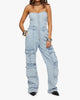 This jumpsuit joins a corset-inspired bodice, featuring a no-slip top edge, to a cargo pant with belt loops, D-ring tab pockets in front, and back patch pockets. It's made from light-wash denim with an exposed metal front zip.