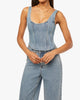 The Denim Scoop Corset is styled with the Wide Leg Denim Pant.