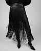 This midi skirt features a wide, mid-rise waistband and layers of vegan leather fringe. It closes at the back with an invisible zipper.