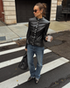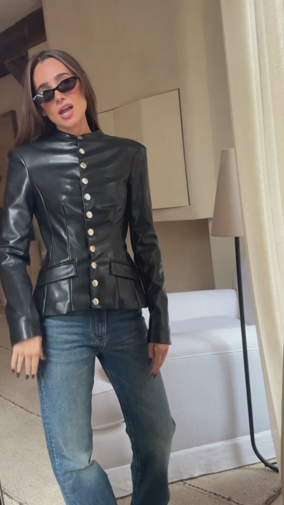 The Vegan Leather Military Jacket pairs well with the Low Rise Western Pant.