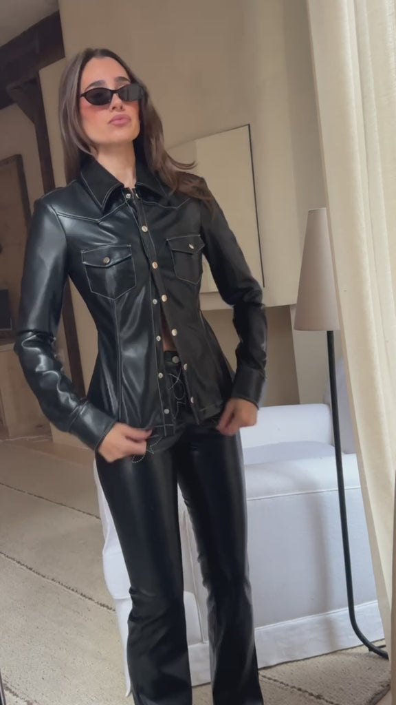This vegan leather button-down top is slim-fitting with patch chest pockets and snap-button closures. It is designed with contrast topstitching that defines the Western finishes of this top.